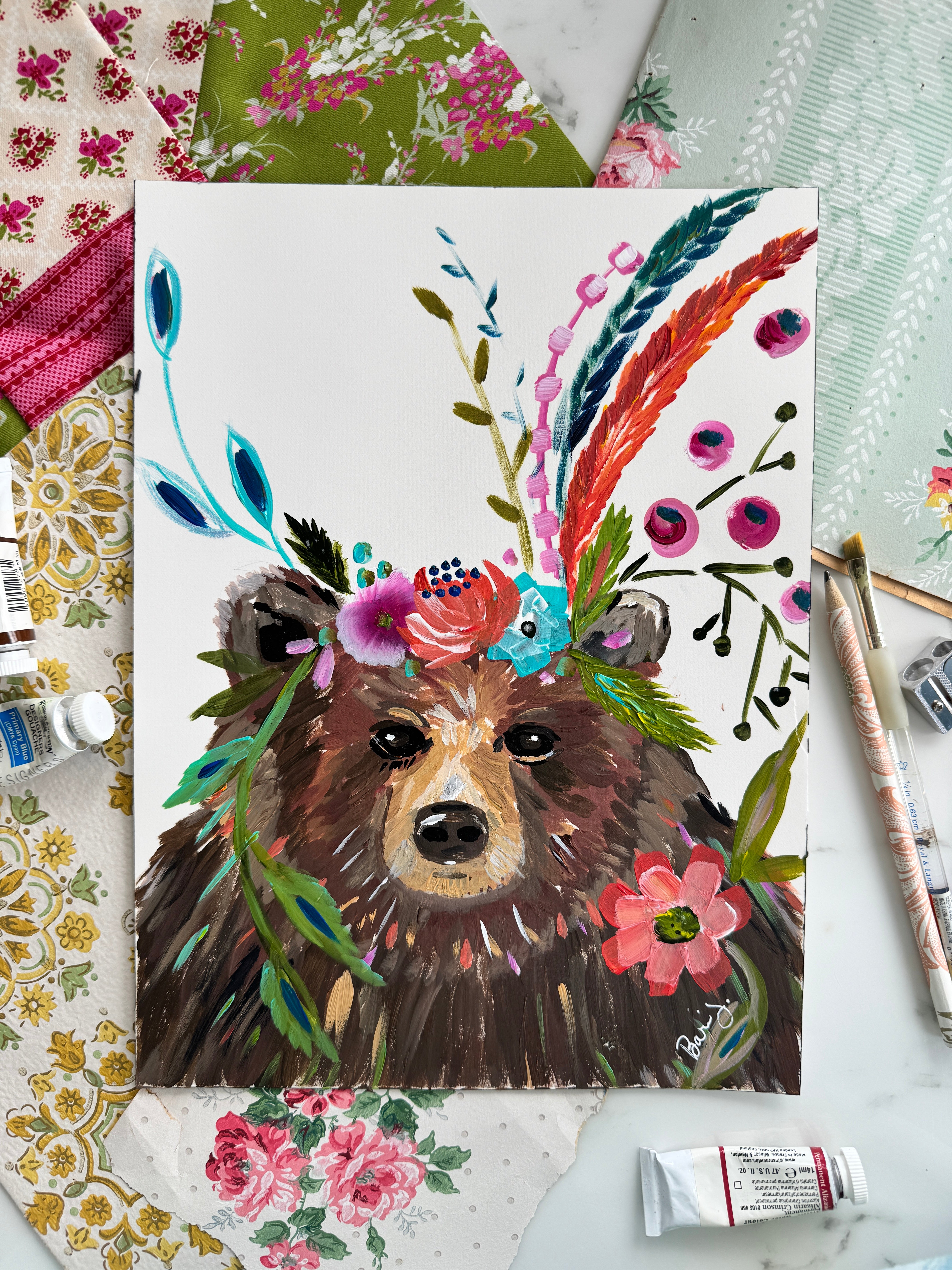 Acrylic on paper, 9 x 12 in. – A gentle mama bear crowned with vivid blooms and foliage. Original hand-painted work. Signed by the artist.