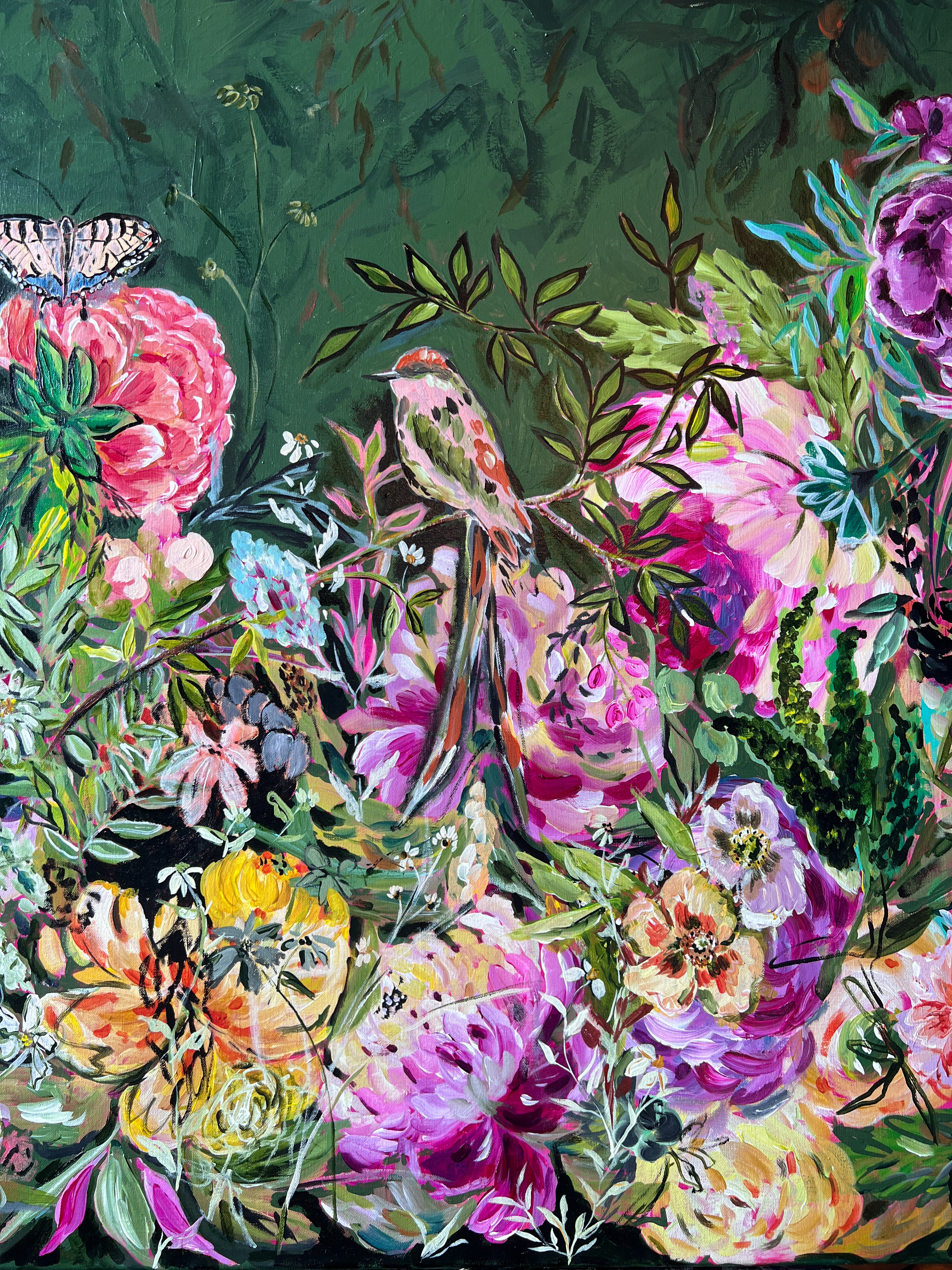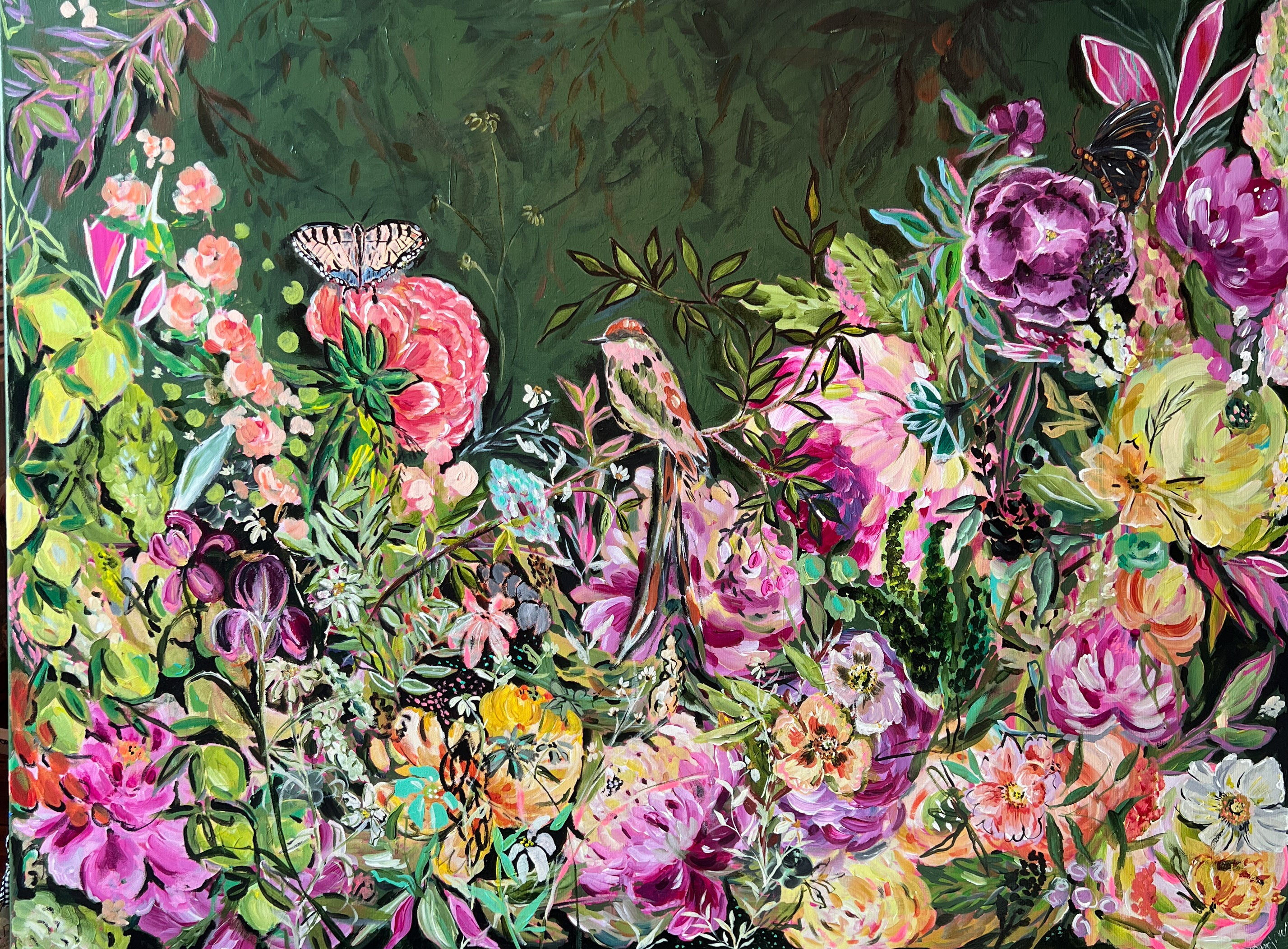 A lush large floral landscape in the setting of an imaginary greenhouse. 36x48x1.5” Ready to hang or frame.